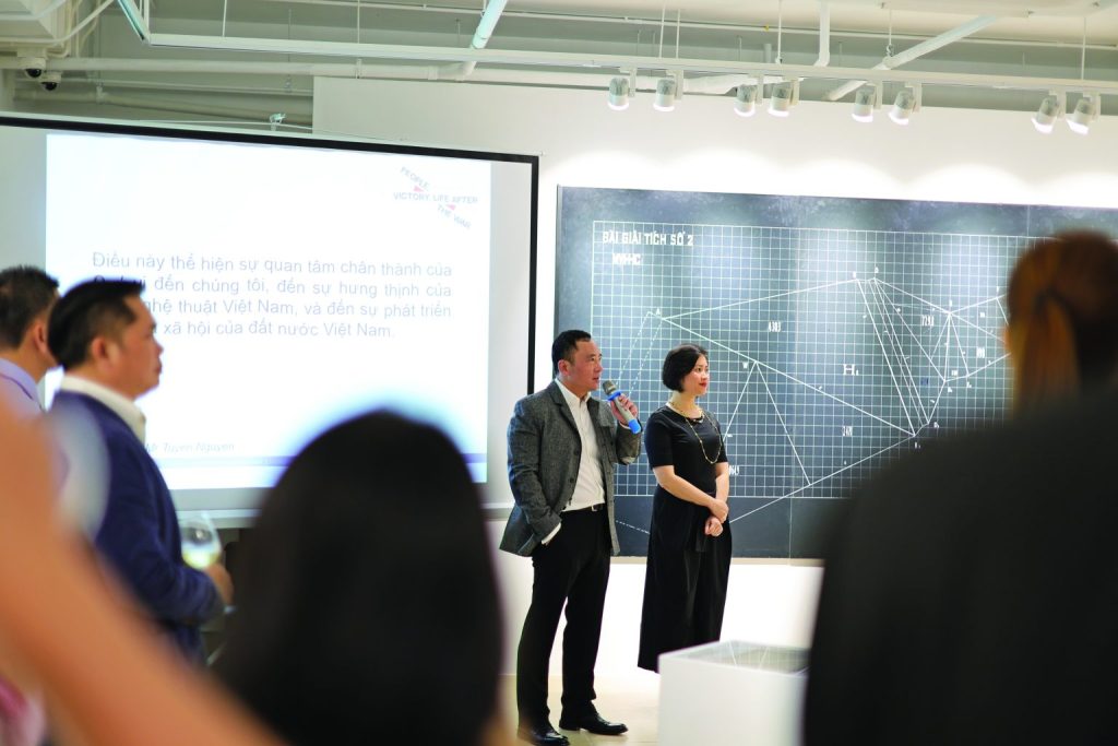 Ông Nguyễn Tuyên và bà Quỳnh Nguyễn tại lễ khai mạc trưng bày Con người, Vinh quang và Cuộc sống sau chiến tranh tại không gian nghệ thuật của EMASI Nam Long.