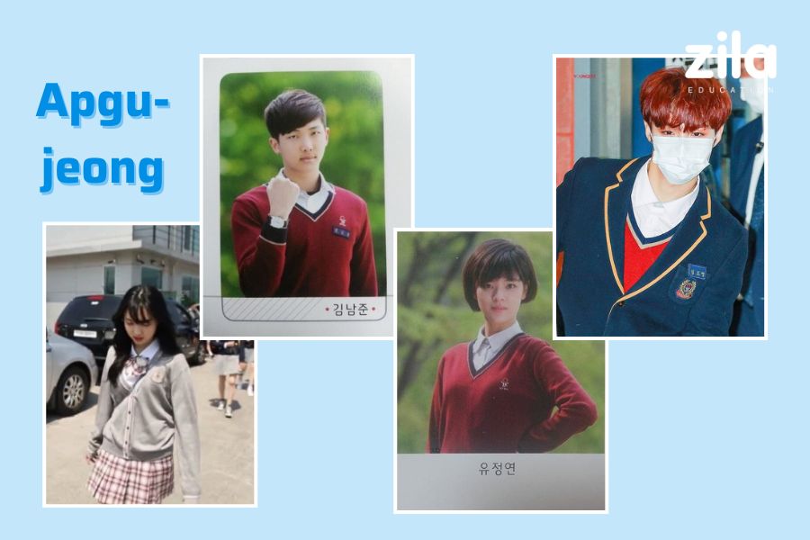 Đồng phục trường Trung học Apgujeong với màu đỏ đô cổ điển và áo khoác màu đen vàng. Bộ đồng phục mang lại cảm giác như một ngôi trường của các quý tộc nước Anh. Ngoài ra, nữ sinh của trường còn có thêm một bộ khác với màu sắc điệu đà, nữ tính. Bộ đồng phục này gồm váy caro và nơ màu hồng nhạt kết hợp với áo cardigan thêu huy hiệu trường.